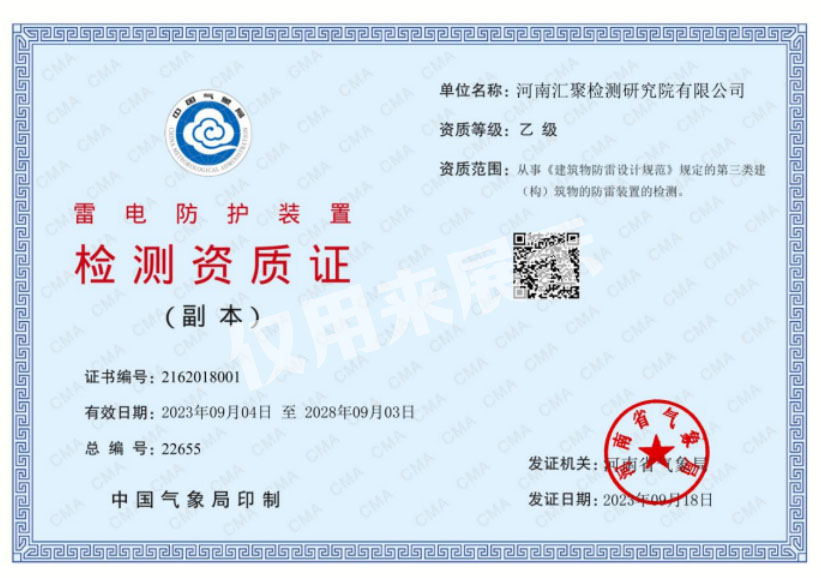 熱烈祝賀河南匯聚防雷檢測(cè)有限公司獲得CMA資質(zhì)